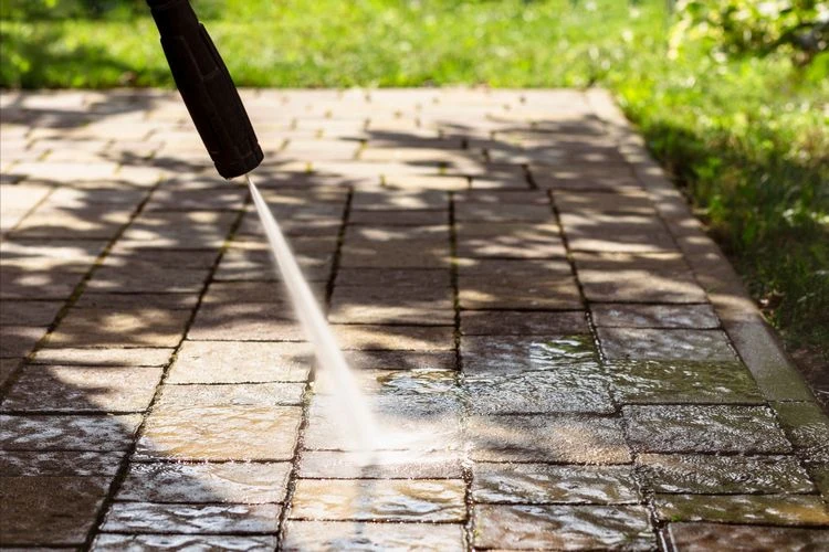 Beachten Sie Folgendes: Achten Sie darauf, dass Sie die Düse nicht zu nahe an das Terrassenmaterial halten, es könnte es beschädigen. Ein starker Wasserstrahl, der direkt auf die Pflastersteine gerichtet ist, kann den Sand zwischen den Fugen lösen oder die Versiegelung entfernen.