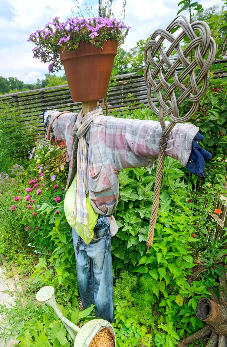 Diese Vogelscheuche ist nicht nur eine praktische Lösung zur Vogelabwehr, sondern auch eine einzigartige Gartenskulptur, die mit ihrem charmanten, rustikalen Aussehen den Garten belebt.