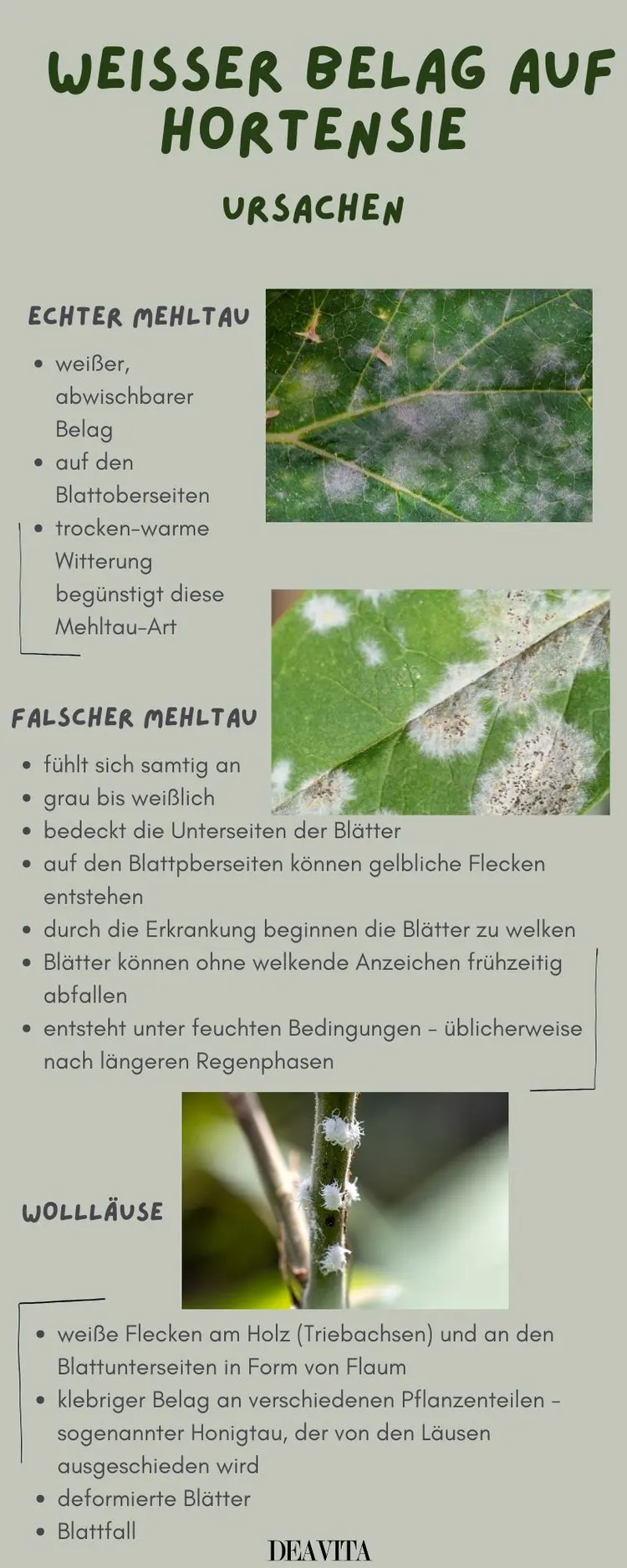 Sie stehen gerade vor Ihrer schönen Hortensie und möchten sie bewundern, als Ihnen plötzlich ein weißer Belag ins Auge sticht. Was ist das denn nun schon wieder?