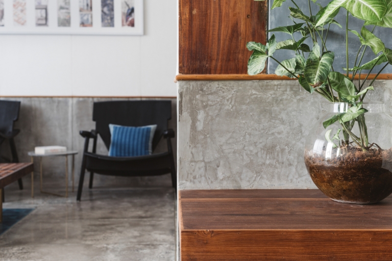 Der Dämmbeton und das Massivolz geben der Wohnung ihren rauen, minimalistischen Look. Die beiden Materialien punkten nicht nur mit einer ansprechenden Optik, sondern auch mit einer angenehmen Haptik. Gerade in Indien sorgt Beton für Abkühlung an heißen Sommertagen und seine polierte Oberfläche fühlt sich angenehm kühl an.