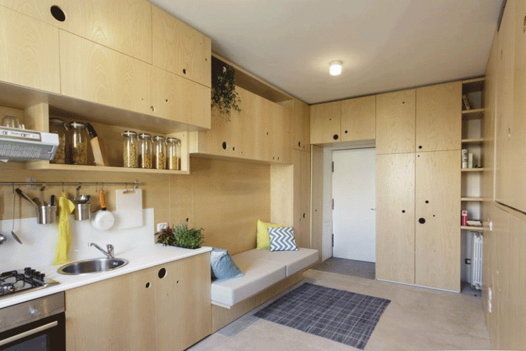 Eschenholz ist wiederum das Material, aus dem die Stufen gefertigt sind. Deren Funktion besteht darin, den Weg zum Hochbett zu ermöglichen. Die Stufen können ohne Mühe auf und zu gemacht werden. Sie werden in diesem Beispiel als Schubladen genutzt, in denen Sie verschiedene kleine Dinge aufbewahren können. Das Hochbett wird aufgemacht, so dass darunter die Kleidungstücke schön geordnet werden können. Ganz bequem, klug und viel Platz wird gespart. Wenn man mit einem Wort die Idee für die Einrichtung dieser Einraumwohnung beschreiben möchte, wird das bestimmt Funktionalität sein. Mit seinen zahlreichen Aufgaben ist zum Beispiel das Hochbett einfach zum Verlieben.