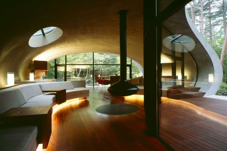 Hinzu kommt ein umweltfreundliches und einfach zu bedienendes Design mit Fußbodenheizung für ein effizienteres Heizen. Das Haus mit indirekter Beleuchtung ist mit einem System ausgestattet, das sich mit nur drei Knöpfen bedienen lässt. Der Innenbereich fällt durch besondere Formen auf. Sie sind organisch gestaltet und finden sich nicht nur in den abgerundeten Wänden wieder. Auch für einige Möbel, wie dem Esstisch, aber auch den Kaminofen wurden ovale Formen gewählt. Diese stehen im Kontrast zu den abstrakten Möbeln, wie der Küche, einem Beistelltisch, sowie manchen Stufen.