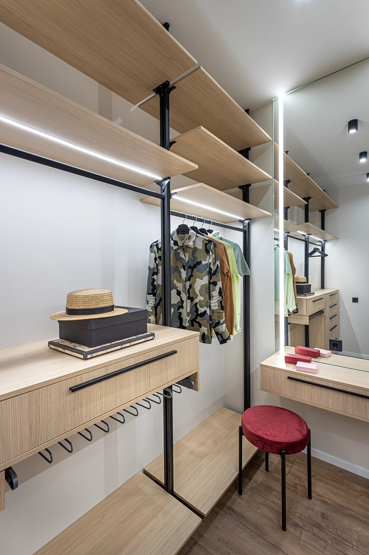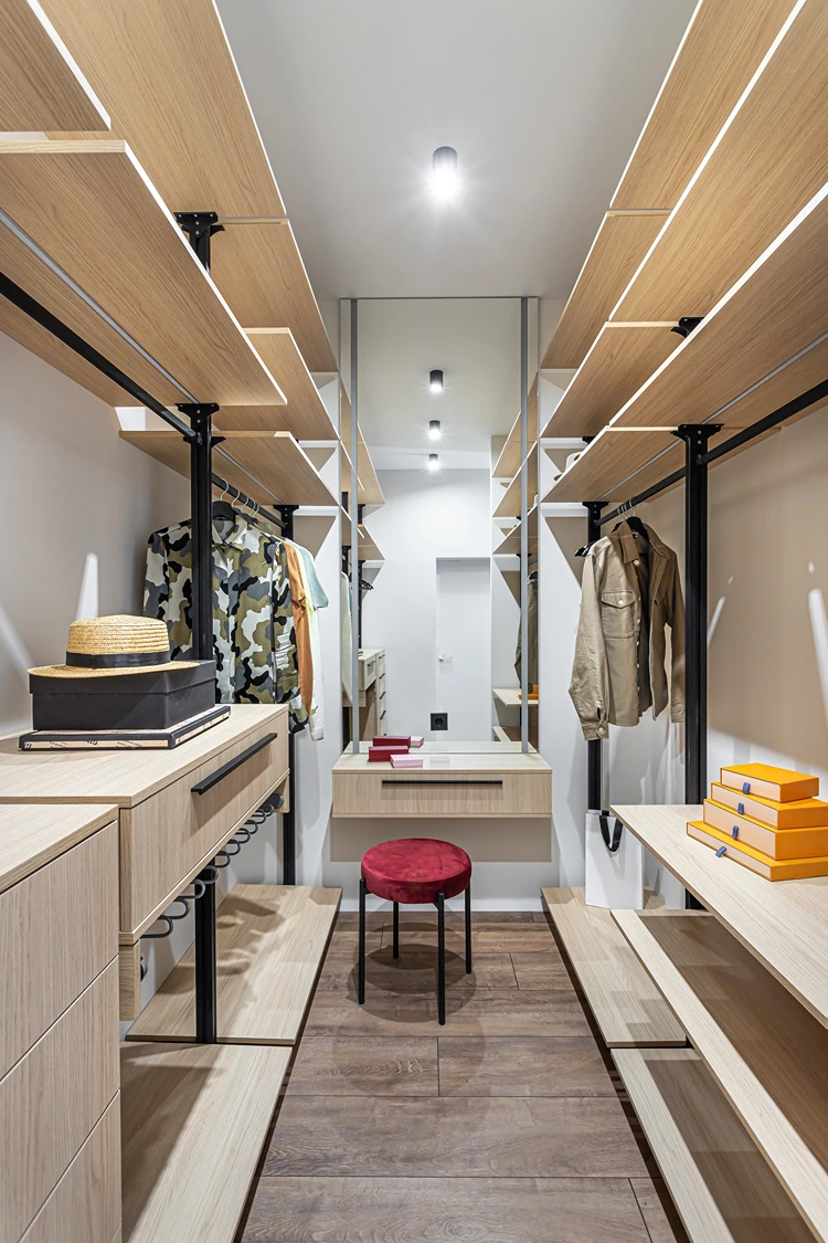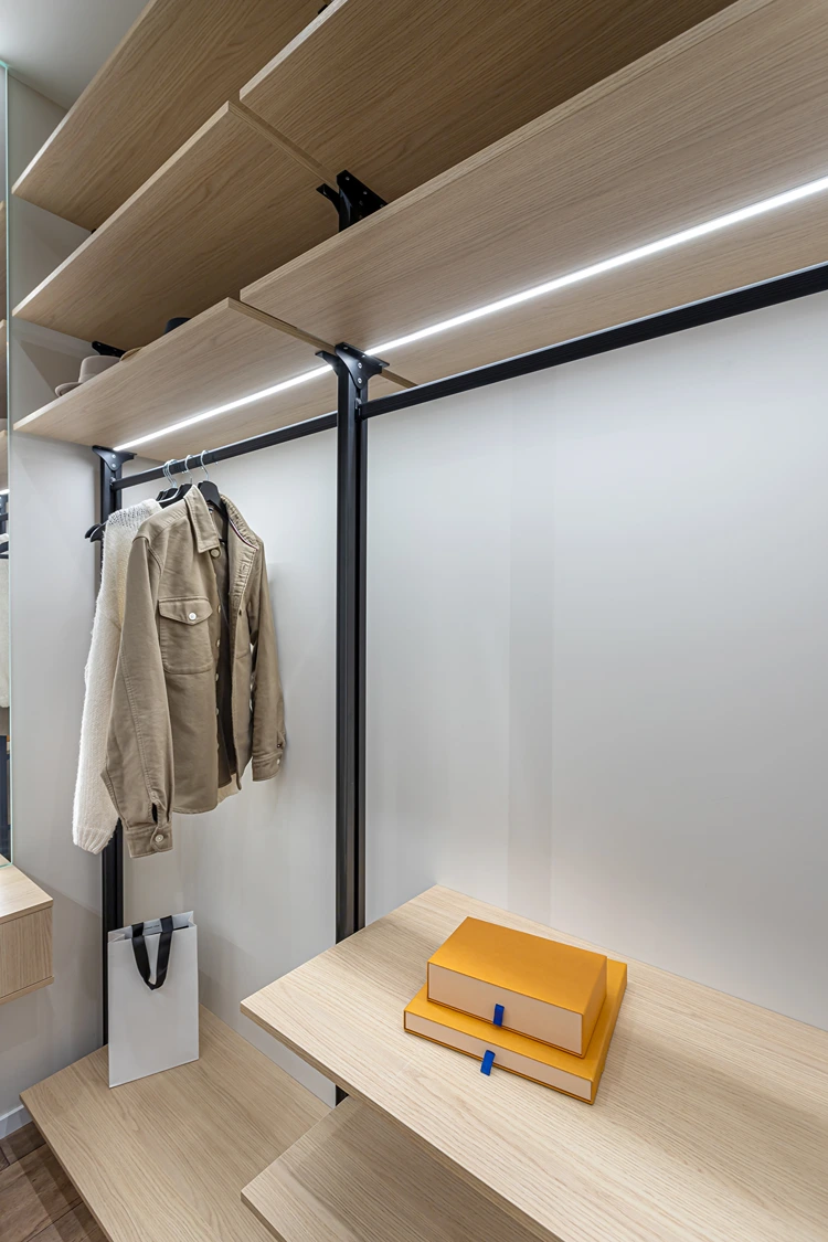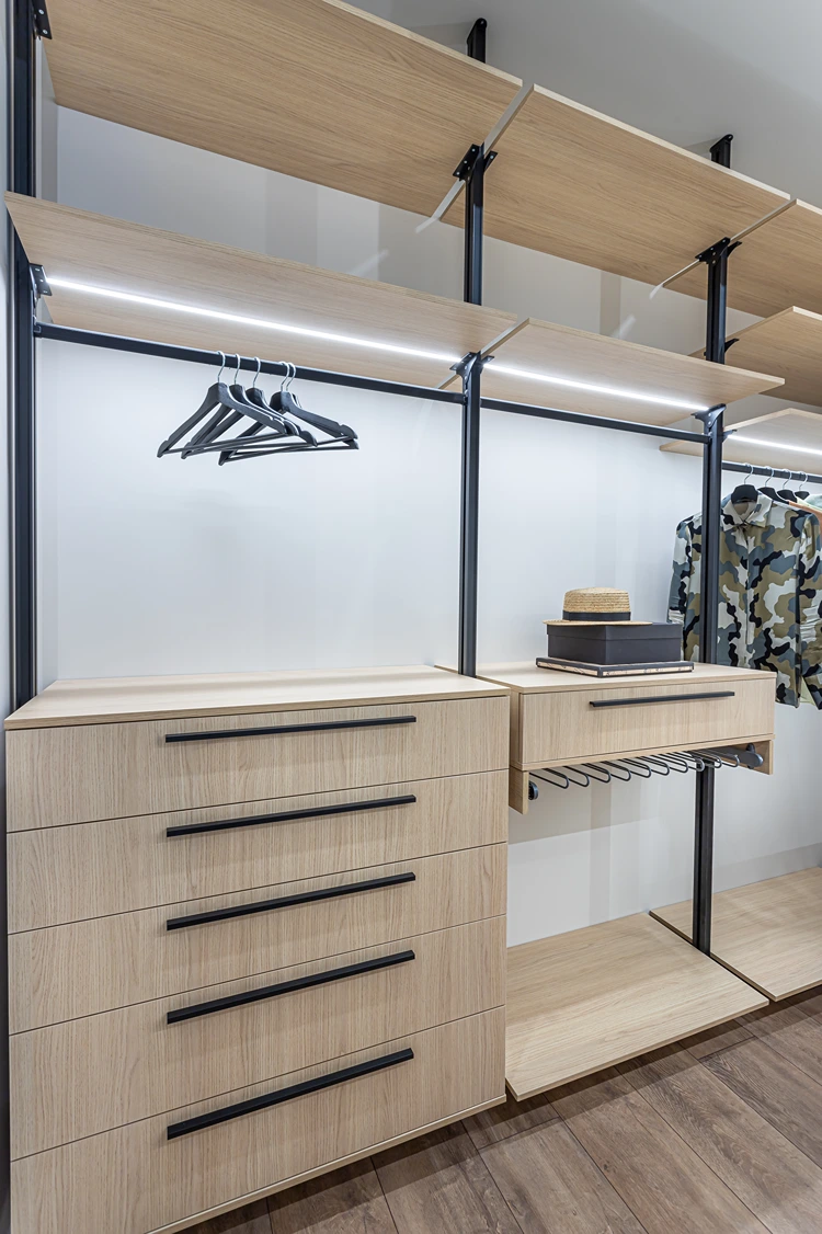 Offene Kleiderstangen mit integrierter Beleuchtung machen es leicht, Lieblingsstücke auf einen Blick zu finden – sei es das Business-Hemd, die Sommerbluse oder die Lieblingsjacke. Darüber und darunter befinden sich offene Regalböden, ideal für Taschen, Schuhe oder dekorative Boxen. Besonders praktisch sind die Schubladenelemente: Flache Varianten für Accessoires, tiefere für Pullover oder Hosen. Und dann das kleine, fast versteckte Highlight: Ein herausziehbares Ablagesystem für Hosen und Krawatten – das ist funktional und platzsparend.