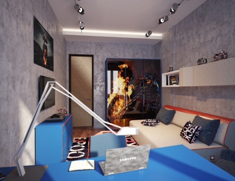 Beleuchtete Fototapeten werden schnell zu modernen Kunstwerken – und können Akzente im ansonsten neutral eingerichteten Räumen setzen. In diesem Fall verziert eine Stadt Skyline die Wand im Wohnzimmer, und Motorrad den Kleiderschrank im Jugendzimmer. Modern und stilvoll!