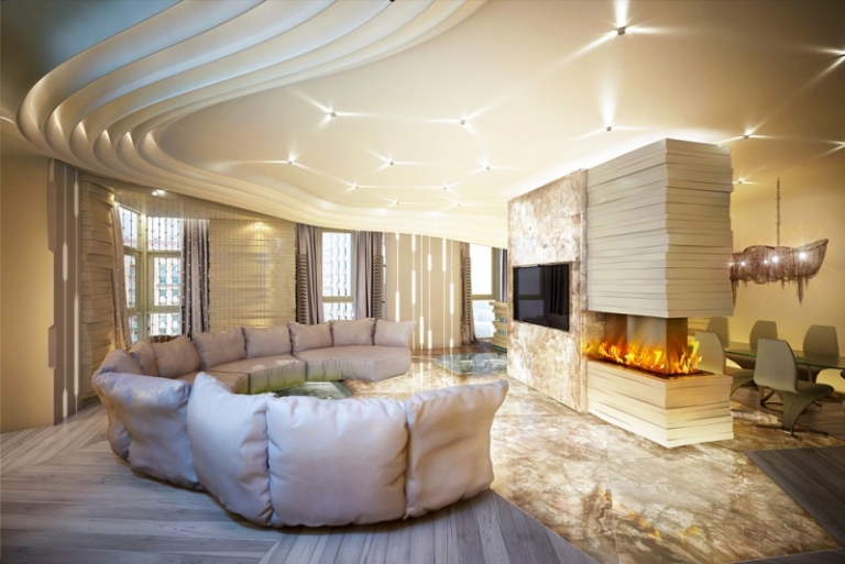 Die Säule im Zentrum des Wohnbereichs kommt dank der Deckengestaltung besser zur Geltung
