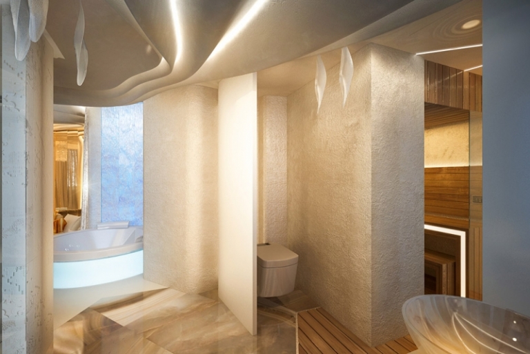 In keinem russischen Interieur darf ein Wellness-Bereich fehlen – das großzügige Badezimmer und die Sauna im Gästehaus werden von den Bewohnern selbst benutzt. Die Naturmaterialien lassen das Interieur wohnlich wirken, und das gelungene Beleuchtungskonzept schafft ein Wohlfühl-Ambiente.