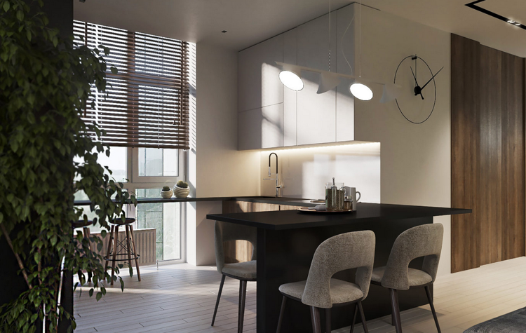 Der Arbeitsbereich ist mit einem Esstisch und einem Küchentresen kombiniert. Die raumhohen Fenster lassen das Tageslicht in den Raum fluten und die schwarzen Elementen weicher wirken. Beim Frühstücken können die Bewohner einen schönen Blick auf den Dnjepr genießen. Alle anderen Einbaugeräte werden in einer freistehenden Einheit montiert. So sieht die Küche ordentlich und aufgeräumt aus.