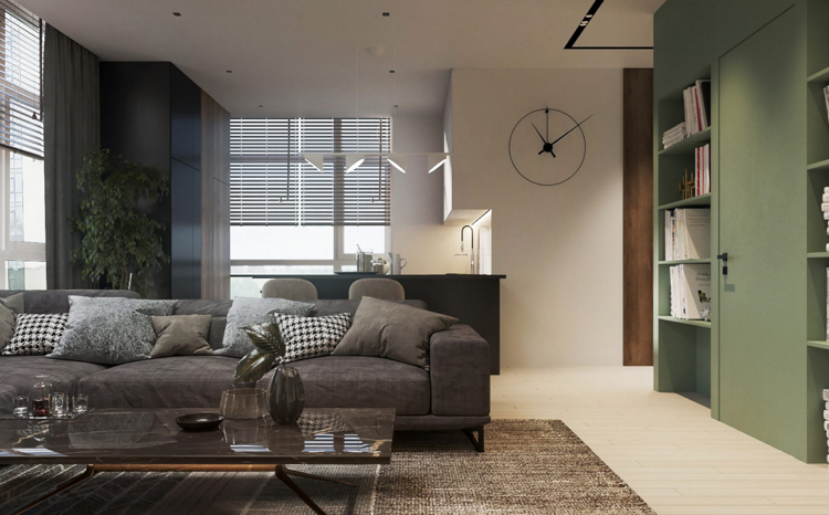 Das Interieur dieser 88 m² großen Wohnung ist für eine junge Familie konzipiert. Es sollte nicht nur praktisch und funktional, sondern auch gemütlich und bequem sein. Ein besonderes Highlight im Wohnzimmer ist die grün gestrichene Wand mit Einbauregal. Die Zimmertür ist im gleichen Grünton gehalten und verschmilzt mit der Wand.
