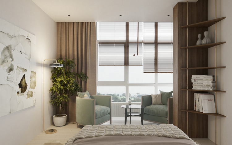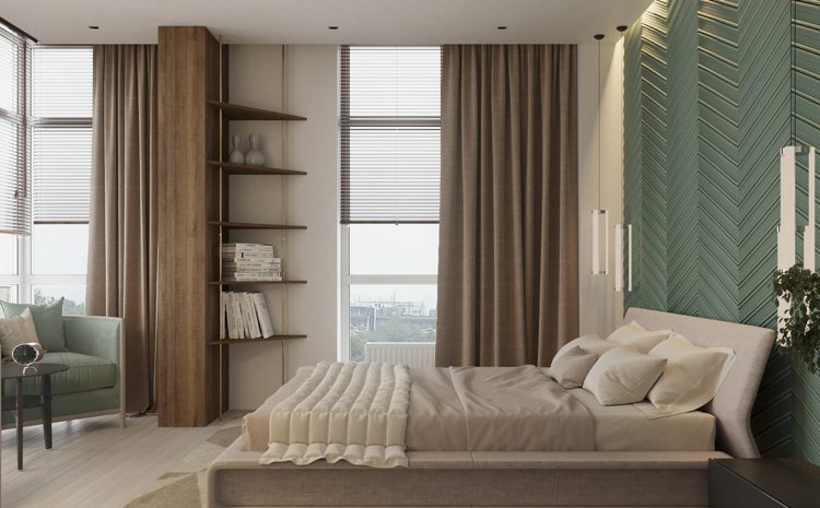 Im Schlafzimmer schafft die Kombination aus Pastellgrün, Creme und Braun ein besonders beruhigendes Ambiente. Die pastellgrüne Tapete an der Wand hinter dem Bett beeindruckt mit einem interessanten 3D Fischgrätmuster. Das Design stammt aus der neuen Serie Spectra von ARTE. Dank der integrierten Schicht aus Schaumgummi ist die Wandverkleidung effektiv auch als Schalldämpfung. Im kleinen Gästezimmer ziert das gleiche Design die Wände, aber in Taupe.