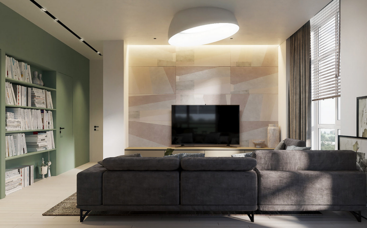 Das helle Parkett im geraden Verband kontrastiert gut mit den Vorhängen, dem Sofa und Teppich in dunklen Grautönen. An der Wand hinter dem Fernseher weisen die atemberaubenden Fliesen von Ceramica Bardelli ein modernes geometrisches Muster auf.