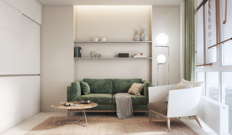 Haare und Nägel in Pastell sieht man auch schon sehr oft. Und kein Wunder, dass diese Einhorn-Farben so beliebt sind, denn sie wirken besonders sanft und freundlich. Pastellgrün zum Beispiel vermittelt den Eindruck von luftiger Frische und klingt auch nach Frühling. Kombiniert mit warmen Beige- und Grautöne ergibt sich ein harmonisches Gesamtbild. Die Raumgestaltung in dieser 3-Zimmer-Wohnung ist ein tolles Beispiel dafür, wie beruhigend und frisch zugleich diese Farbkombination wirkt.