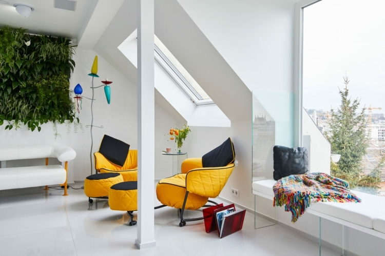Große Fensterfronten garantieren den perfekten Ausblick über die Stadt, wobei eine Sitzbank aus Glas es ermöglicht, am Fenster zu entspannen. Bereits hier sind gelbe Möbelstücke und Deko-Accessoires zu finden, die in den Räumen mit weißen Wänden, weißen Fliesen und weißer Decke Abwechslung schaffen. Hinzu kommen üppige Bepflanzungen wie der vertikale Garten, der eine Akzentwand bildet und eine lebendigere Atmosphäre in der urbanen Umgebung garantiert.