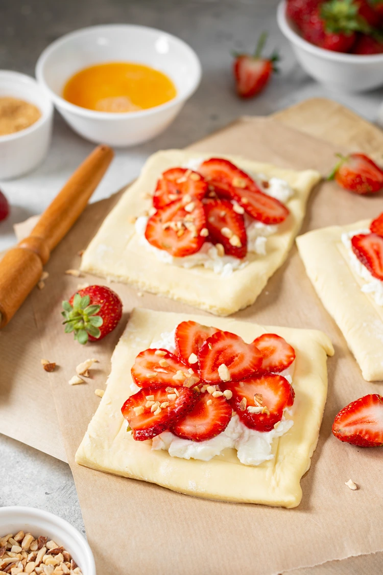 Lassen Sie sich von der Kombination aus knusprigem Blätterteig, frischen Erdbeeren und cremiger Käsefüllung verzaubern!