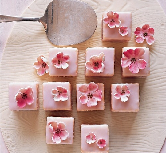 - Kuchen querweise halbieren. Die untere Hälfte mit passierten Kirschen bestreichen und die obere Hälfte daraufsetzen. Für 1 Stunde in den Kühlschrank stellen. In 4,5 bis 5 cm große Quadrate schneiden und diese auf ein Backpapier legen. Jedes Häppchen mit Zuckerguss bestreichen, sowohl auf der Oberfläche, als auch seitlich. Für 20 Minuten in den Kühlschrank stellen und danach mit den Kirschblüten dekorieren. Diese interessante Idee für Fingerfood wird sich allen Familienmitgliedern gut gefallen.