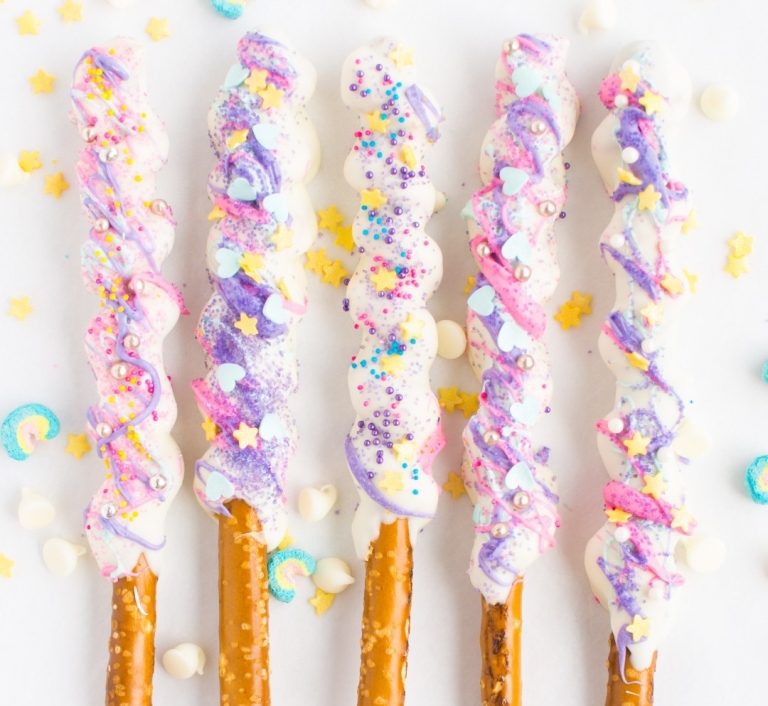 Sie planen einen Kindergeburtstag und möchten die kleine Prinzessin überraschen? Diese Einhornsalzstangen in Regenbogen-Farben zaubern garantiert eine märchenhafte Atmosphäre. Schokolieren Sie die Salzstangen und bestreuen Sie sie mit Konfetti und Glitzerperlen. Verzieren Sie sie dann mit Zuckerdekor wie Sterne und Herzen. Wählen Sie Pastellfarben wie Lavendel, Himmelblau, Gelb und Rosa. Sie können mit Pink Akzente setzen. Die weiße Schokolade bildet den perfekten Hintergrund für die kreative Dekoration.