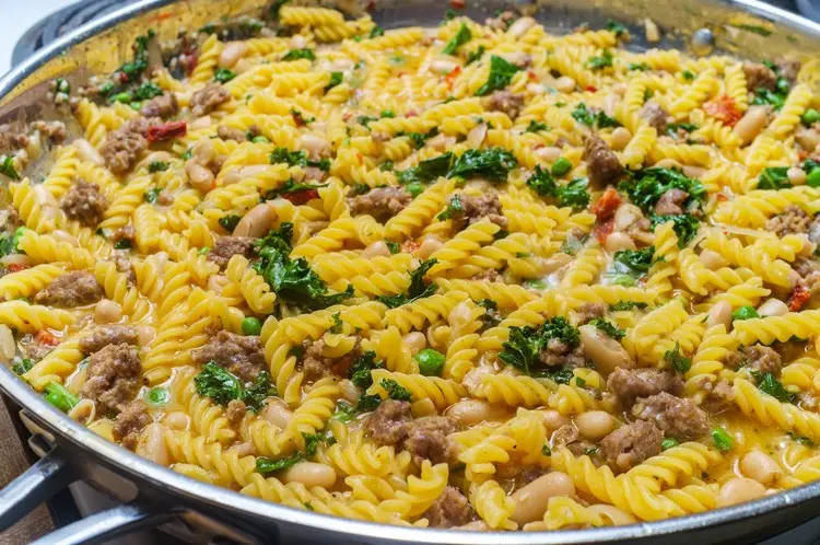 Sie können jede beliebige Art von Pasta nehmen, vorausgesetzt, es handelt sich um eine Sorte mit kurzer Garzeit (möglichst nicht mehr als 6 Minuten).