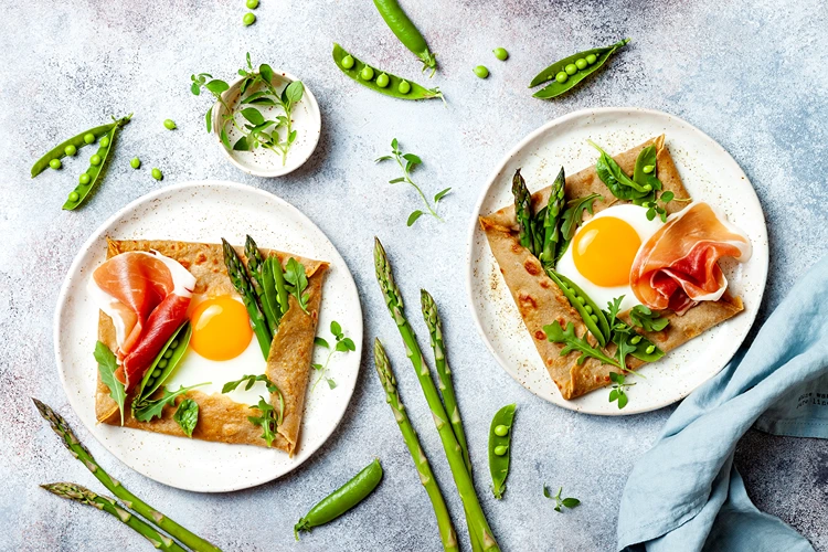 Die bretonische Galette aus Buchweizenmehl (französisch galette de sarrasin) ist eine traditionelle Spezialität aus der französischen Region Bretagne. Anders als süße Crêpes werden Galettes herzhaft gefüllt – mit Käse, Ei, Schinken, Gemüse oder Fisch. In diesem Rezept kombinieren wir zarten grünen Spargel, frische Erbsen, Schinken und ein Spiegelei zu einer köstlichen Frühlings-Galette – einfach, sättigend und typisch französisch!
