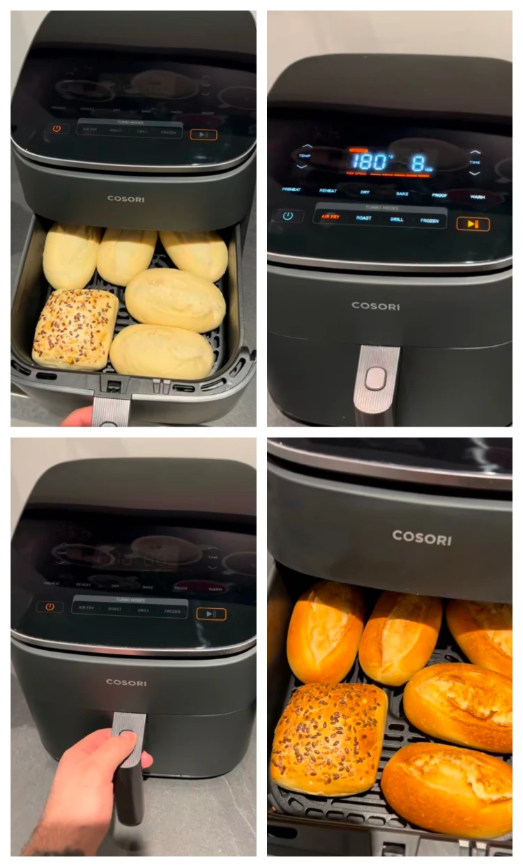 - Kein Vorheizen nötig: Einfach Brötchen reinlegen und starten – der Airfryer ist sofort bereit.