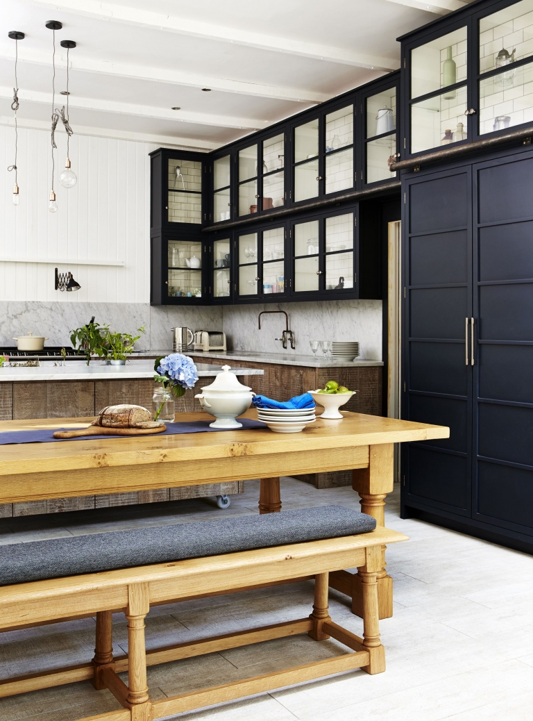 Der traditionelle und rein weiße Look ist nichts für Sie? Wenn Sie sich eine einzigartige und dennoch richtig schöne und elegante skandinavische Küche wünschen, die sich von der Masse abhebt, dann können Sie diese ruhig mit dunkleren Farben einrichten. Auch wenn Schwarz für diesen Wohnstil eher untypisch ist, können Sie damit wundervolle, starke Kontraste setzen. Eine schwarze Küchenzeile, ein Schrank oder eine faszinierende Kücheninsel können wunderbar einen Mittelpunkt in einem ansonsten neutralen Raum bilden. Wenn Schwarz für Sie doch etwas zu viel ist, versuchen Sie es stattdessen mit dunkleren Grautönen oder einem tiefen Blau. Die typische nördliche Gemütlichkeit lässt sich in dem Fall ganz einfach durch die passenden Accessoires, wie ein Wollteppich oder Holzbrettchen, kreieren.
