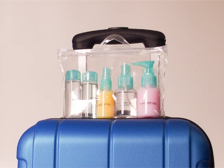 In Flugzeugen dürfen Flüssigkeiten nur in Behältern à max. 100 ml mitgenommen werden – und alle zusammen müssen in einen transparenten, wiederverschließbaren 1-Liter-Beutel passen. Dieser muss bei der Sicherheitskontrolle separat vorgezeigt werden.