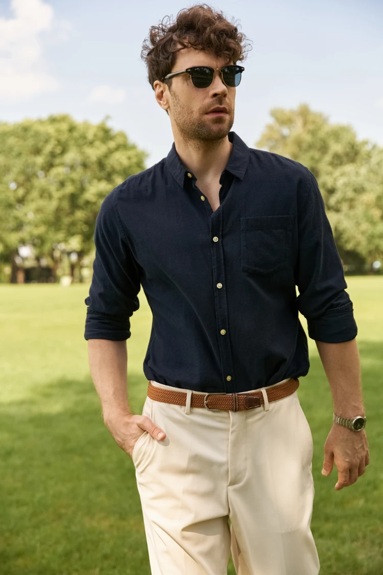 Weißes oder hellblaues Leinenhemd (gerne leicht offen getragen)