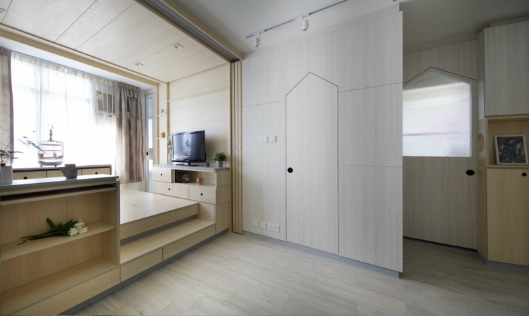 Das Design Studio schuf eine Einrichtung und platzsparende multifunktionale Möbel, die den Bedürfnissen und Anforderungen für ein angenehmes Leben in einer Wohnung entsprechen. Dabei kommen auch die Haustiere nicht zu kurz. So bekommt der Vogel seinen eigenen Bereich am nach Westen ausgerichteten Fenster des Wohnzimmers, da er Sonnenbäder liebt. Um ihn dabei vor der Katze zu schützen, kann eine praktische Schiebetür zugeschoben werden, die auf diese Weise das Wohnzimmer in zwei Bereiche teilt. Damit der hintere Bereich dabei aber nicht zu dunkel wird, wurden praktische Glasscheiben in die Tür integriert. Mit Hilfe der Schiebetür entsteht auch gleichzeitig der private Schlafbereich des jungen Paares.