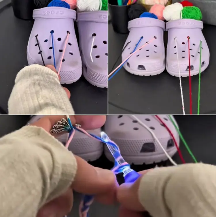 Wieder sind es die Löcher, die alte Crocs für diese Upcyling-Idee so praktisch machen. Wenn Sie gerne und oft häkeln, könnte Ihnen dieses Accessoire die Arbeit einfacher machen.