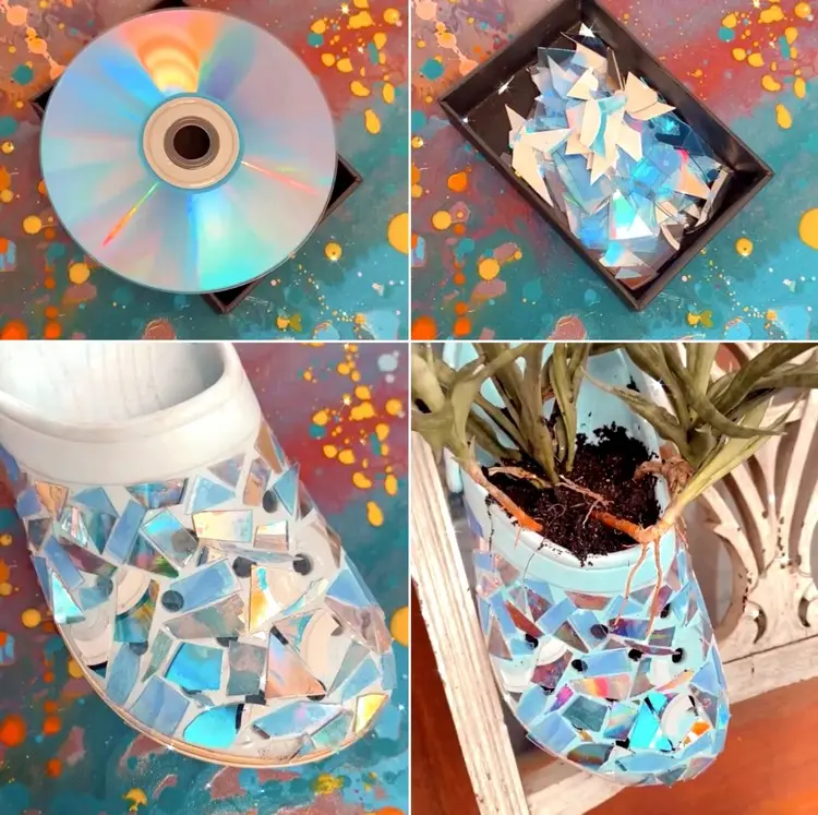 Die Zeiten der CD’s sind längst vorbei und besonders die selbst gebrannten funktionieren meist nicht mehr. Sollten Sie ein paar solcher CD’s übrig haben, können Sie sie in Stücke brechen und anschließend auf dem Schuh verteilen, um ein schimmerndes Mosaik zu kreieren. Eine praktische und schöne Gartendeko zugleich! Sie brauchen einen starken, flexiblen Kleber. Gut geeignet sind die Varianten, die wir weiter unten aufgelistet haben.