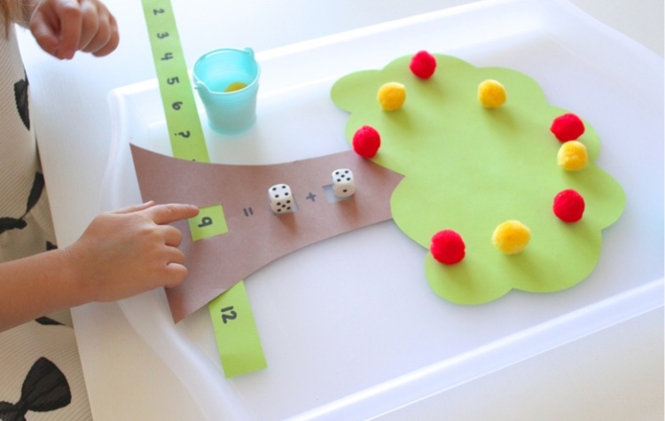 Sie können zusammen mit den Kindern auch das Addieren und das Subtrahieren üben. Basteln Sie einen Apfelbaum aus Tonkarton und zeichnen Sie die Konturen der Äpfel. Schreiben Sie verschiedene Aufgaben auf selbstklebendes Papier, schneiden Sie sie aus und kleben Sie sie auf die Äpfel. Schneiden Sie dann Äpfel aus rotem Tonkarton aus und schreiben Sie verschiedene Zahlen darauf. Das Kind soll die Aufgabe lösen und dann den Apfel mit der Antwort finden. Zum Beispiel: