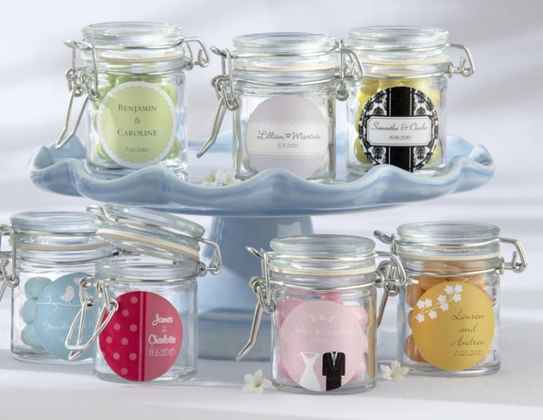 Süßigkeiten lassen sich schnell in dekorativen Tütchen oder andere Behälter verpacken und sind eine billige Variante für Gastgeschenke zur Hochzeit. Wählen Sie kleine Bonbons in Ihren Hochzeitfarben oder wählen Sie einen kleinen Beutel aus Seide oder Organza. Erstellen Sie kleine Etiketten mit Ihren Namen, Hochzeitsdatum oder einem herzlichen Dankeschön, um das Geschenk zu personalisieren.