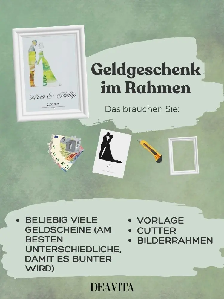 Nur wenige Materialien und Hilfsmittel benötigen Sie, um dieses kreative und schöne Geldgeschenk im Rahmen zu erstellen: