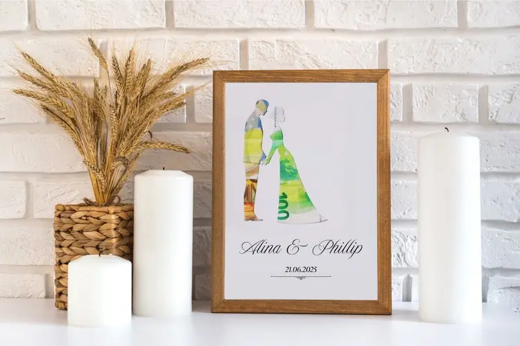 Personalisierte Details hinzufügen Sie können unter oder über der Silhouette einen kleinen Schriftzug einfügen – Namen, Datum oder Anlass (z. B. „Zum schönsten Tag“, „Zur Taufe von …“, etc.). So wird das Geschenk individuell und emotional wertvoller.