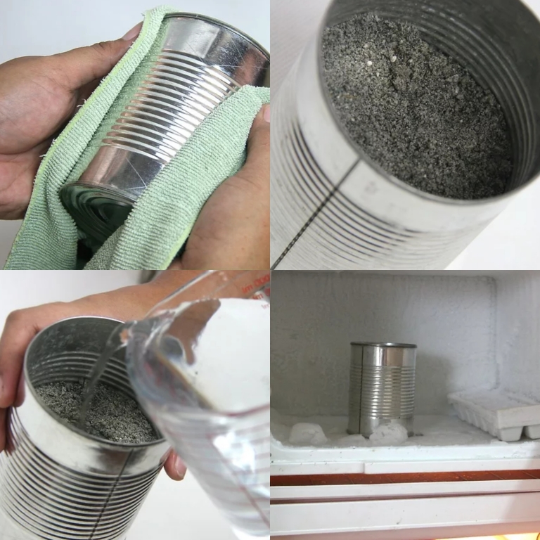 - Bereiten Sie die Dose zum Einfrieren vor – es verhindert, dass sie sich verformt, sobald Sie mit dem Hämmern beginne. Füllen Sie die Dose zu 3/4 mit Sand (verhindert das Ausbeulen im gefrorenen Zustand) . Fügen Sie Wasser hinzu und lassen Sie die Dose im Gefrierfach für 3-4 Stunden.