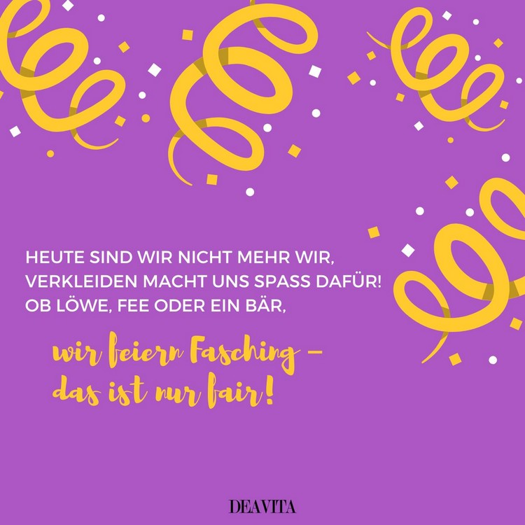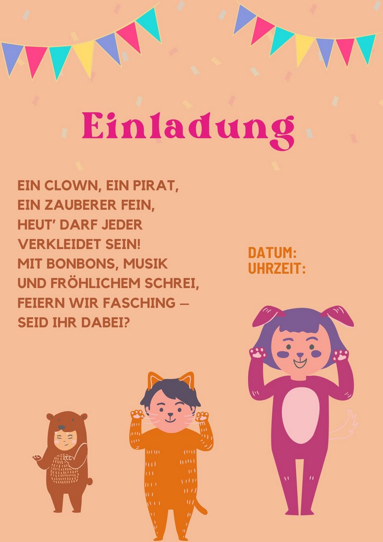 Sowohl zum Auswendiglernen, als auch als Einleitung für Einladungskarten beispielsweise, sind die Fasching-Sprüche für Kinder bestens geeignet. So wird die strikte Struktur einer Einladung mit ein bisschen Witz aufgelockert und die Gäste kommen sofort in Stimmung. Falls Sie also Ihre eigene Party geplant haben, können Sie die Texte als Anregung nutzen.