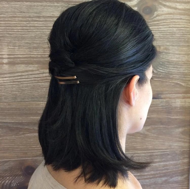Wer mittellanges Haar hat, kann mit dem halb hochgesteckten, halb heruntergelassenen Look nichts falsch machen. Er verleiht einen Hauch von Klasse und Eleganz. Um den Look auf die nächste Stufe zu heben, verzieren Sie Ihre Haare mit Haarschleife oder einem anderen zarten Haarschmuck.