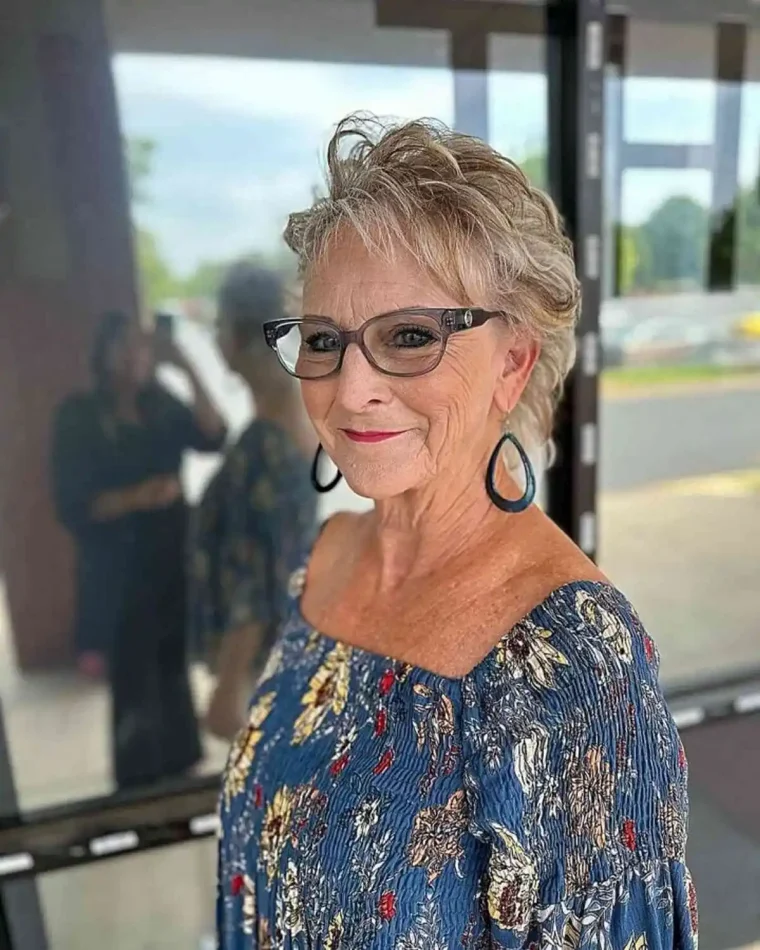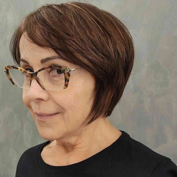 Dieser Kurzhaarschnitt ist eine der trendigsten Kurzhaarfrisuren für Frauen über 60 und sieht sehr gut aus. Die Form und die Farbe sind sehr feminin und auffallend und sie ergänzen sich gut. Wenn Sie Brille tragen, können Sie diesen angesagten Kurzhaarschnitt im Betracht ziehen!