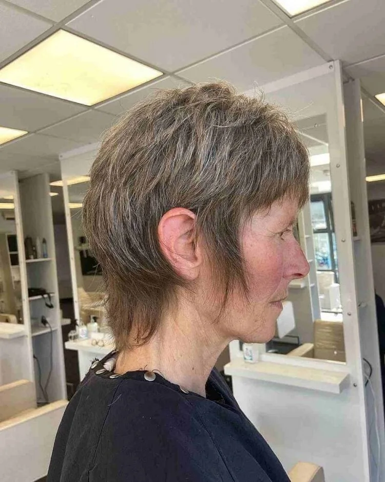 Der schmeichelhafteste Schnitt für natürlich graues Haar ist ein gut strukturierter Pixie. Er verleiht der Trägerin dank seiner starken Linienführung ein kantiges, gepflegtes Aussehen. Für Frauen mit schlanker Statur über 60 ist dieser Pixie Cut mit Undercut eine gute Wahl.