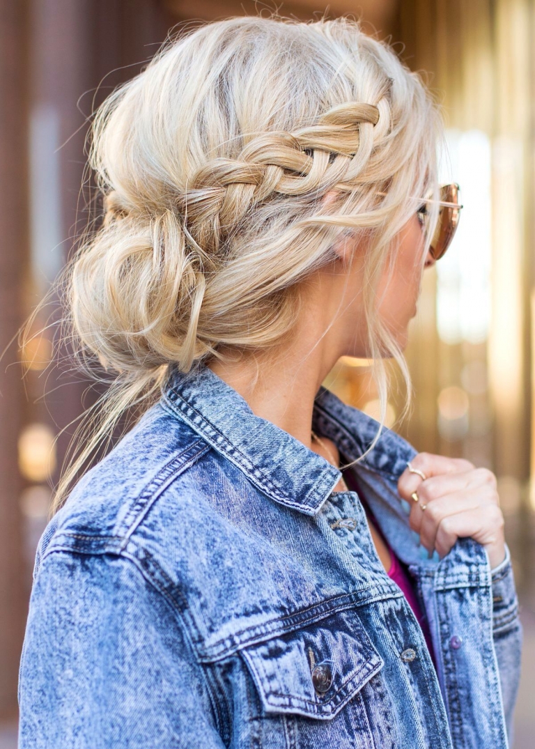 Wenn Sie lange Haare haben, dann werden Ihnen Messy Bun Frisuren in Boho Style besonders gut stehen. Damit die Frisur wirklich lange hält, sollten Sie die Haare im voraus mit Salzspray besprühen. Warten Sie ab, bis die Haare komplett trocken sind und dann können Sie eine Flechtfrisur stylen. Flechten Sie die Haare an den beiden Seiten des Kopfes zu zwei Seitenzöpfen und fassen Sie dann die beiden Zöpfen zu einem tiefen Dutt am Hinterkopf zusammen. Den Dutt können Sie mit Bobby-Pins fixieren. Diese Frisur ist perfekt für ein erstes Date geeignet.