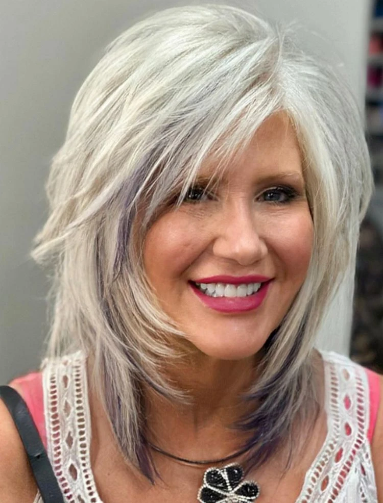Ein Tipp für das Styling: Lassen Sie die Fransen des Ponys an der Luft trocknen, um einen natürlichen Look zu erzielen. Sie können auch die Spitzen mit einer Rundbürste leicht nach außen stylen. Diese Frisur passt gut zu grauem oder gefärbtem Haar und sieht auch beim Nachwachsen stilvoll aus.