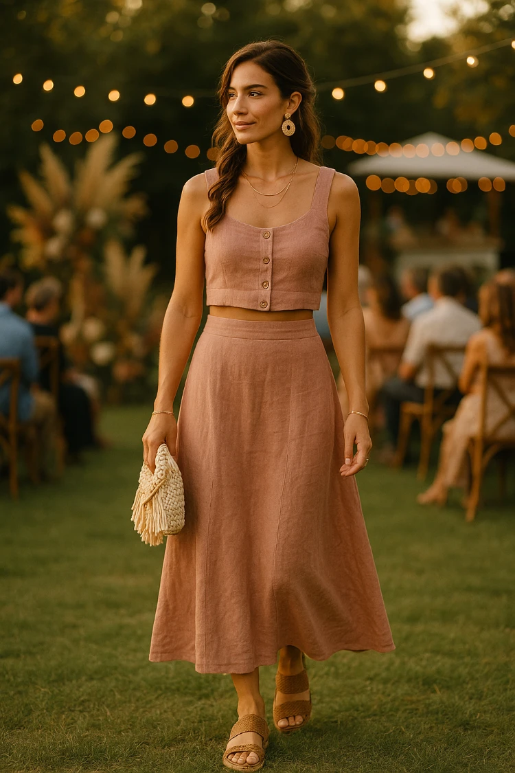 Ein Zweiteiler aus Crop-Top und Rock ist ideal für Sommer- oder Gartenhochzeiten. Materialien wie Leinen oder Baumwolle sind angenehm und sehen natürlich aus. Erdtöne oder sanfte Muster passen super zum Boho-Stil.