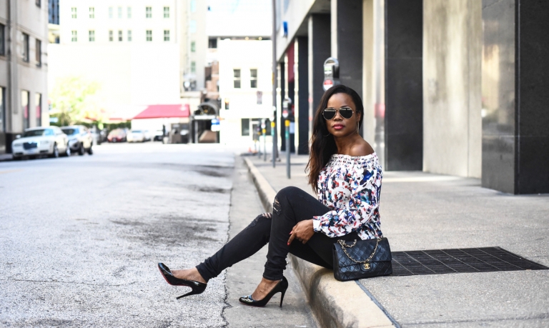Schulterfreie Bluse mit Blumenmustern und Jeans