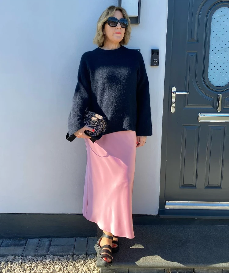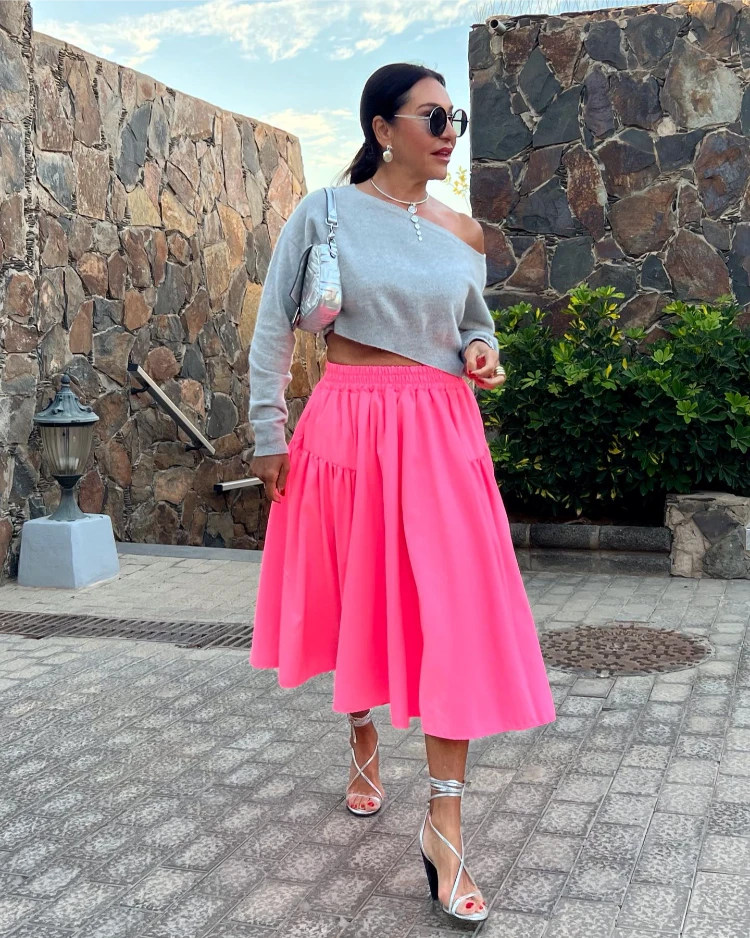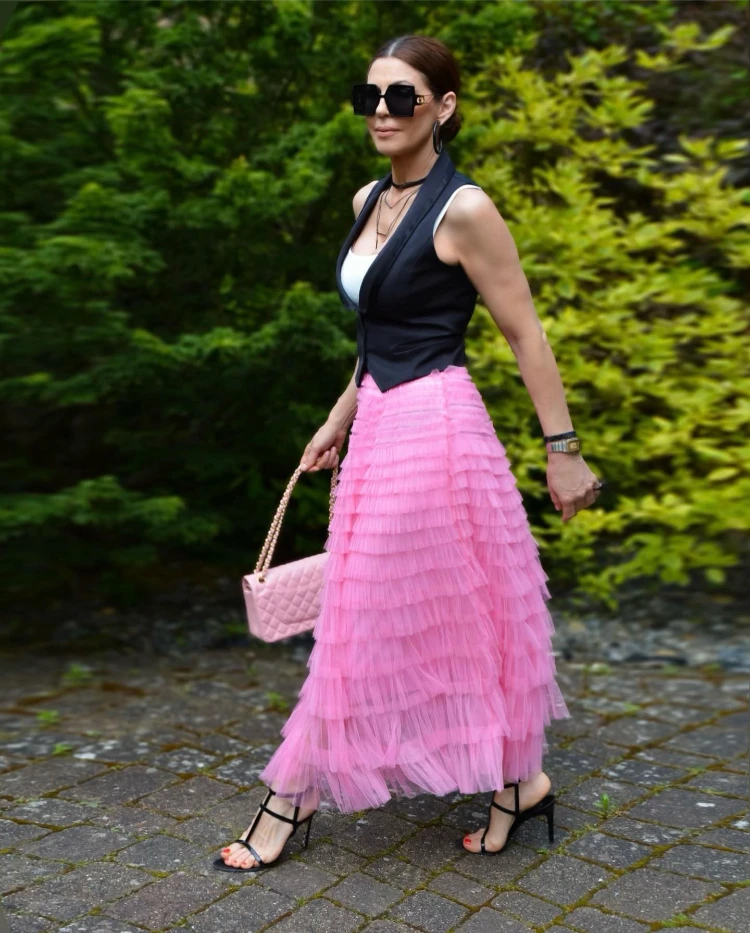 - Mit einem Seidenoberteil und hohen Sandalen: Für ein glamouröses Outfit kombinieren Sie den pinken Rock mit einem fließenden Seidenoberteil und hohen Sandalen – ideal für den Abend.