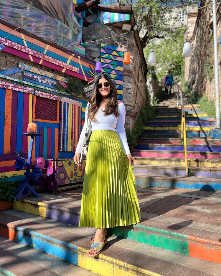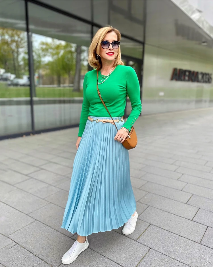 - Kombination: Plisseerock in kräftigem Türkis, Sonnengelb oder Fuchsia – kombiniert mit einem leichten Stricktop oder Pullover in Kontrastfarbe wie Zitronengelb oder Koralle.