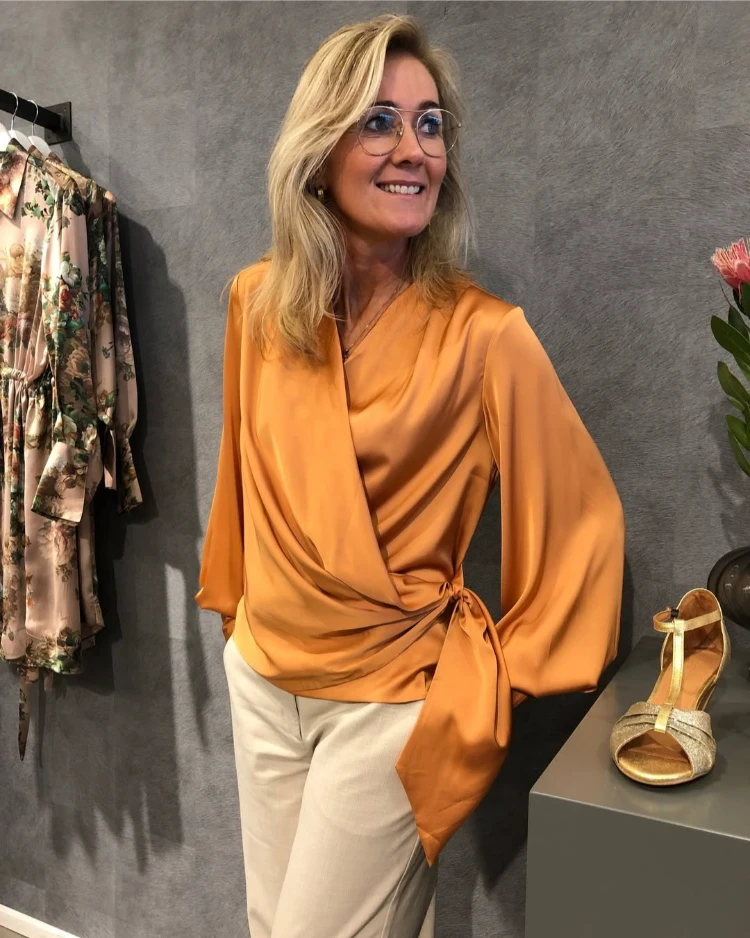 - Bluse: Eine elegante Bluse aus Chiffon oder Seide wirkt edel und festlich. Achten Sie darauf, dass die Bluse nicht zu durchsichtig ist, damit der Look nicht zu leger wirkt.