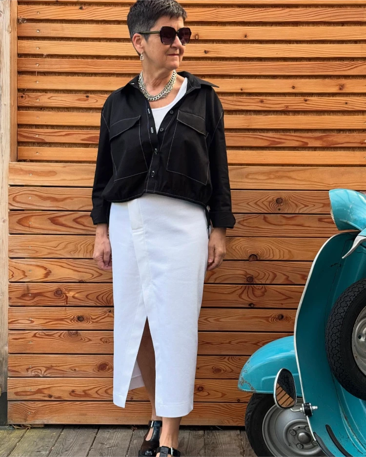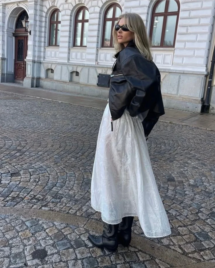 Ein weißer Rock in Kombination mit einer schwarzen Lederjacke sorgt für einen spannenden Kontrast. Dieser Look ist ideal für kühle Sommerabende oder einen Abendspaziergang.
