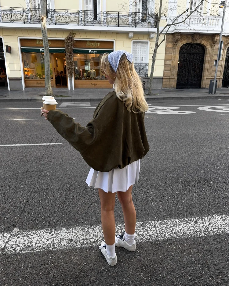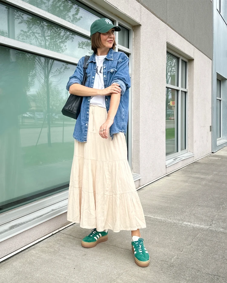Ein weißer Rock und eine Jeansjacke – diese Kombination ist perfekt für den Frühling, wenn die Temperaturen schwanken. Sie sorgt für einen lässigen, aber stylischen Look, der auch an kühlen Tagen gut funktioniert.