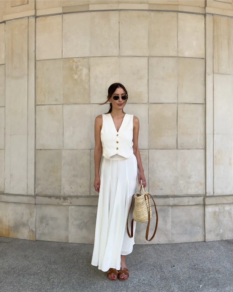 Ein langer weißer Rock in fließendem Material ist perfekt für warme Sommertage. Kombiniert mit einem figurbetonten Crop-Top entsteht ein luftiger und trotzdem stylischer Look. Ideal für Festivals, Urlaub oder den Wochenendtrip.