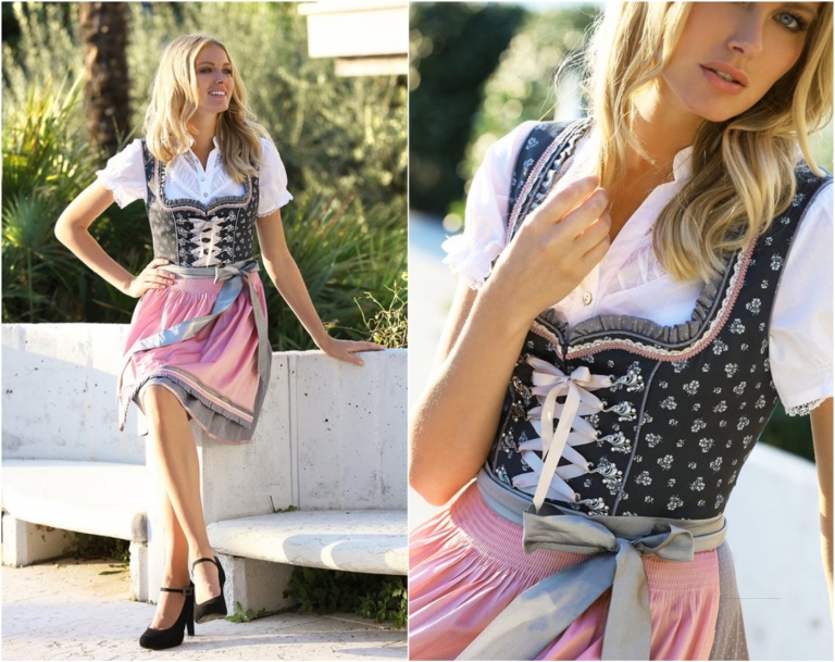 Blondinen mit heller, blasser Haut sollten Dirndlkleider in knalligen Farben wie Orange, Rot und Gold meiden. Pastellfarben wie Mintgrün, Lavendel, Babyblau und alle anderen Farbtönen mit einem blauen oder grauen Unterton schmeicheln besonders dem Porzellanteint. Bei Grau gilt die Faustregel: Je heller der Hautton, desto dunkler der Grauton – und andersherum. Ein Kleid in Anthrazit zum Beispiel lässt besonders blaue Augen strahlen und sieht hervorragend mit rosa Schürze aus.