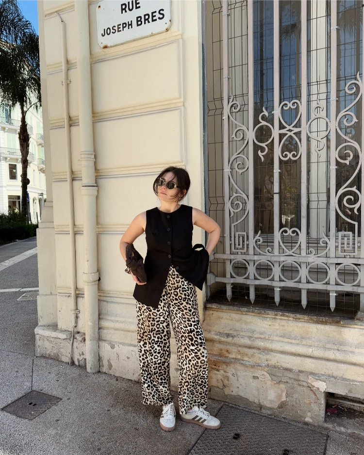 - Fließende Stoffhosen in einem ähnlichen Naturton oder mit einem auffälligen Muster (z. B. Leopard)