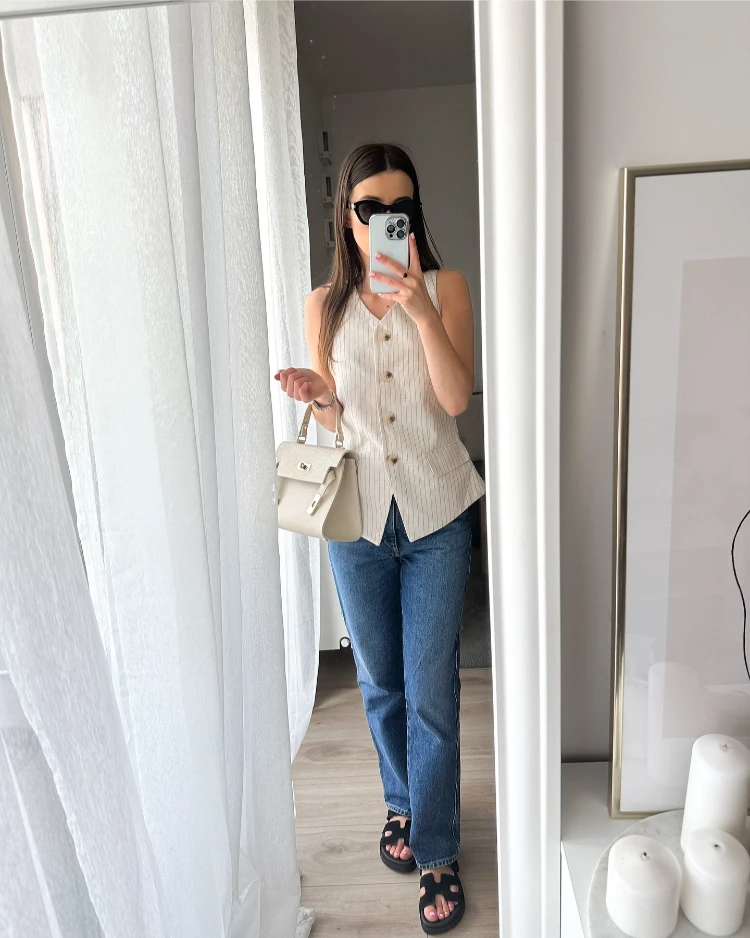 Sie lieben entspannte Looks mit Stilgefühl? Dann ist diese Kombination genau richtig. Wenn Sie auf Instagram nach „Quiet Luxury“ oder „Scandi-Chic“ suchen, sehen Sie genau diesen Look: eine Weste aus Leinen oder Baumwolle, dazu eine weit geschnittene Hose – fertig ist der skandinavisch inspirierte Sommerlook.